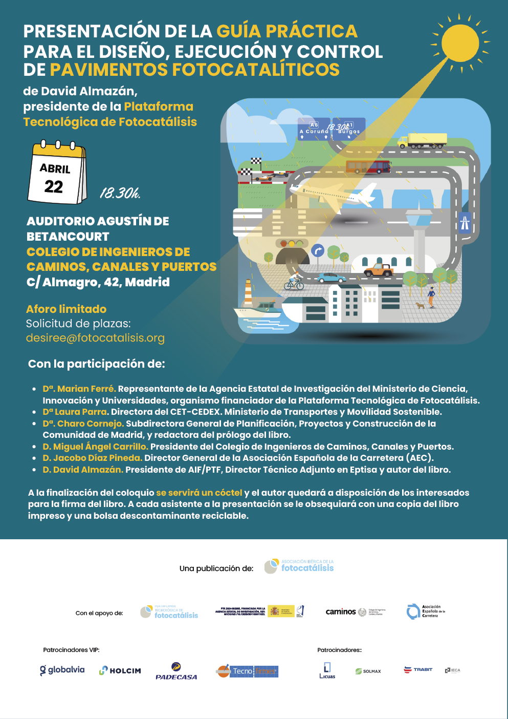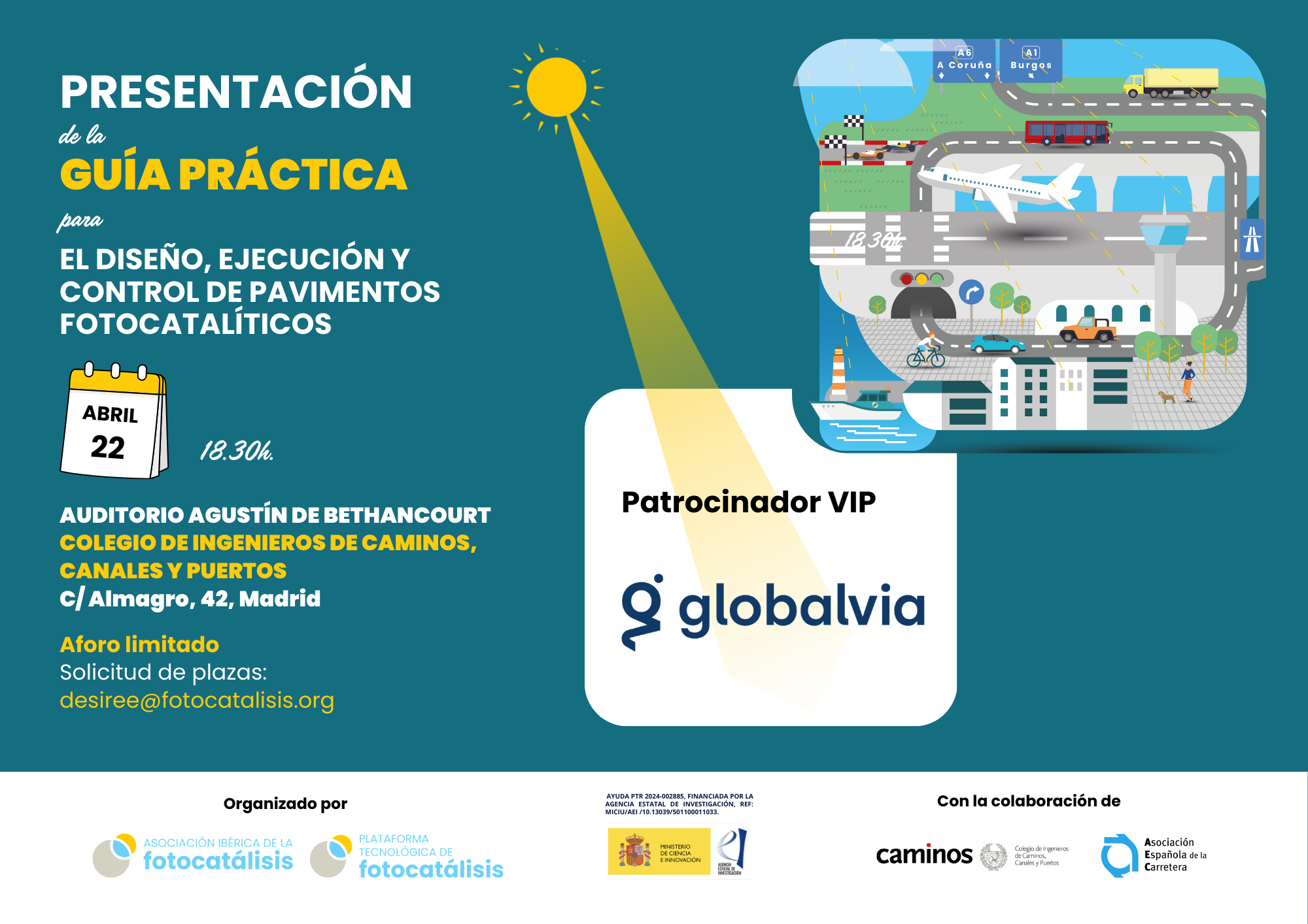 La Asociación Ibérica de la Fotocatálisis (AIF) y la Plataforma Tecnológica de la Fotocatálisis (PTF) anuncian la incorporación de Globalvia como Patrocinador VIP del evento de presentación de la Guía Práctica de Pavimentos Fotocatalíticos, una cita clave para el sector de las infraestructuras y la movilidad sostenible.