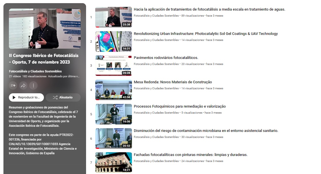 Ya se pueden visionar todas las presentaciones y ponencias del reciente Congreso Ibérico de Fotocatálisis 2023, celebrado el 7 de noviembre en Oporto. De alto interés para urbanistas, investigadores, administraciones públicas, medioambientalistas, profesionales de la salud, arquitectos… ¡Muchas gracias a todos los ponentes, participantes y patrocinadores!